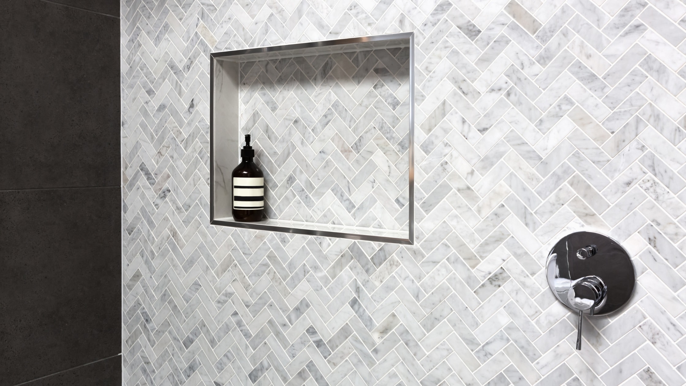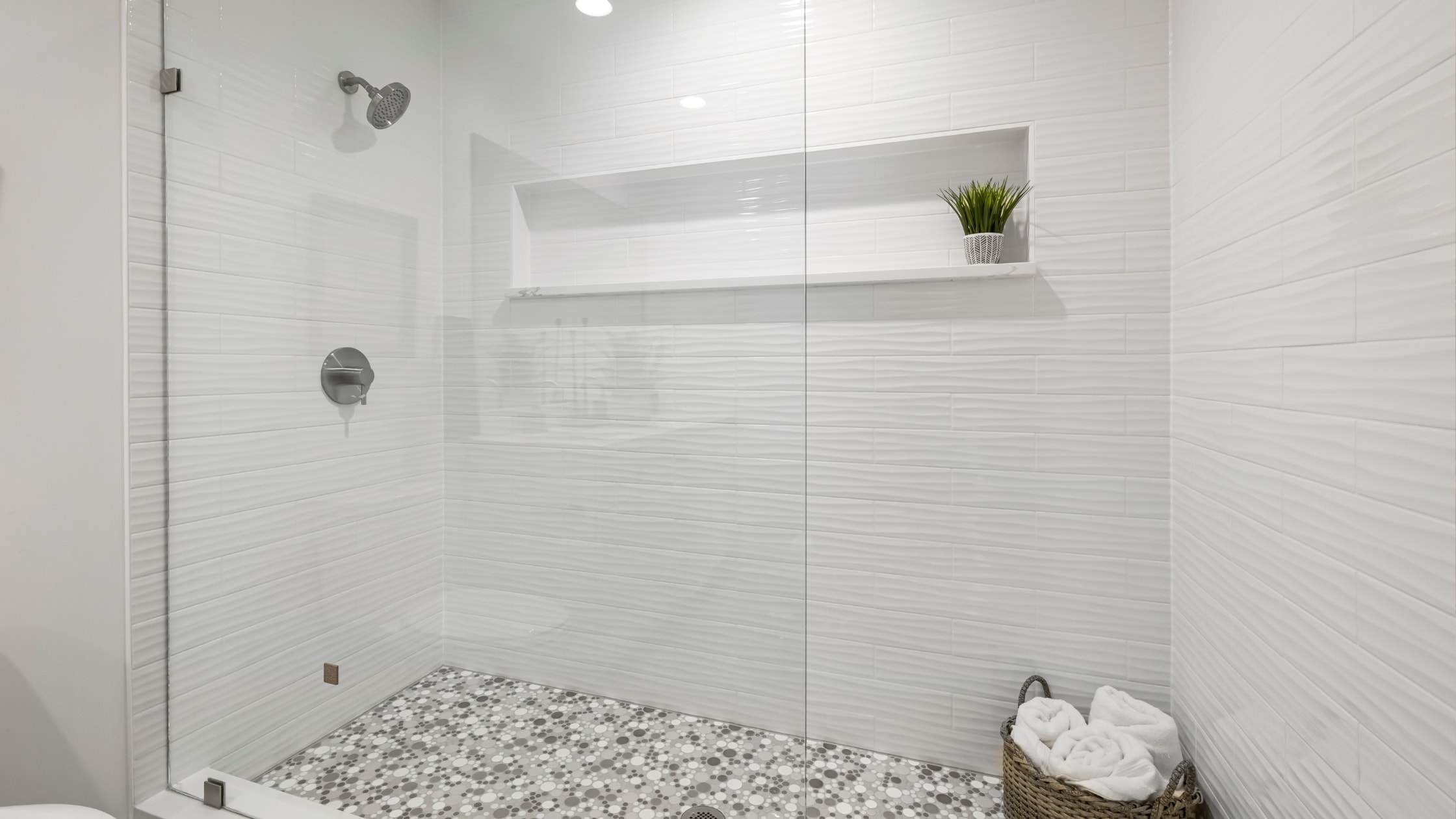 Big Blue’s Tip: Install a built in shower bench along one of your shower walls to add both functionality and visual appeal. This feature provides a comfortable seating area while creating additional storage space below.